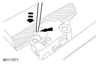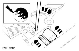 1. Using a small pick, carefully push the tensioner rack pawl retainer away from the rack pawl and compress the tensioner plunger and rack using a vise.