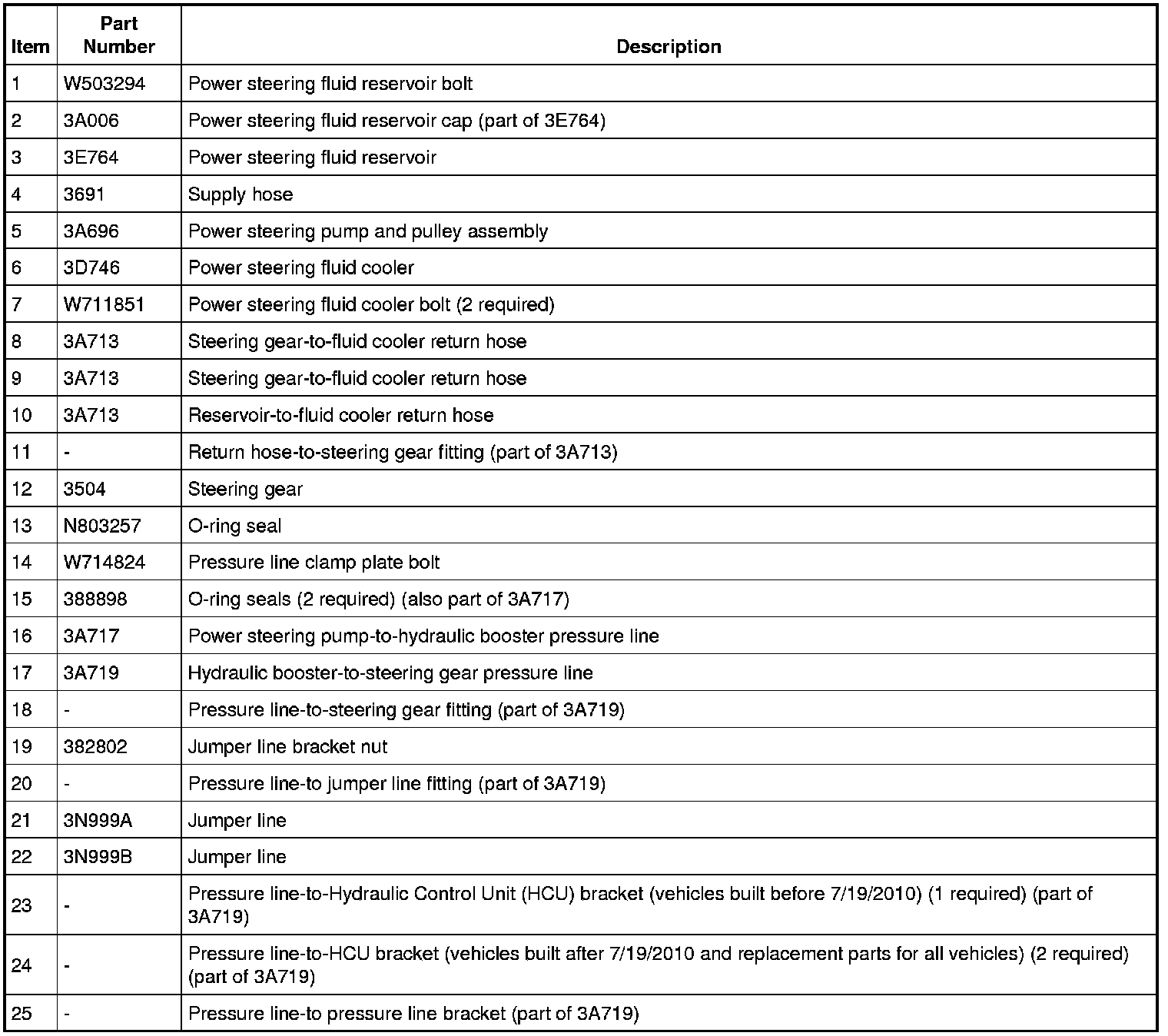 NOTICE: The power steering pump-to-hydraulic booster pressure line (3A717) and the hydraulic booster-to-steering gear pressure line (3A719) must both be replaced together on vehicles built before 7/19/2010. The lines can be replaced individually on vehicles that are built after 7/19/2010. Failure to install the correct parts may result in damage to the lines and/or fluid leaks.
