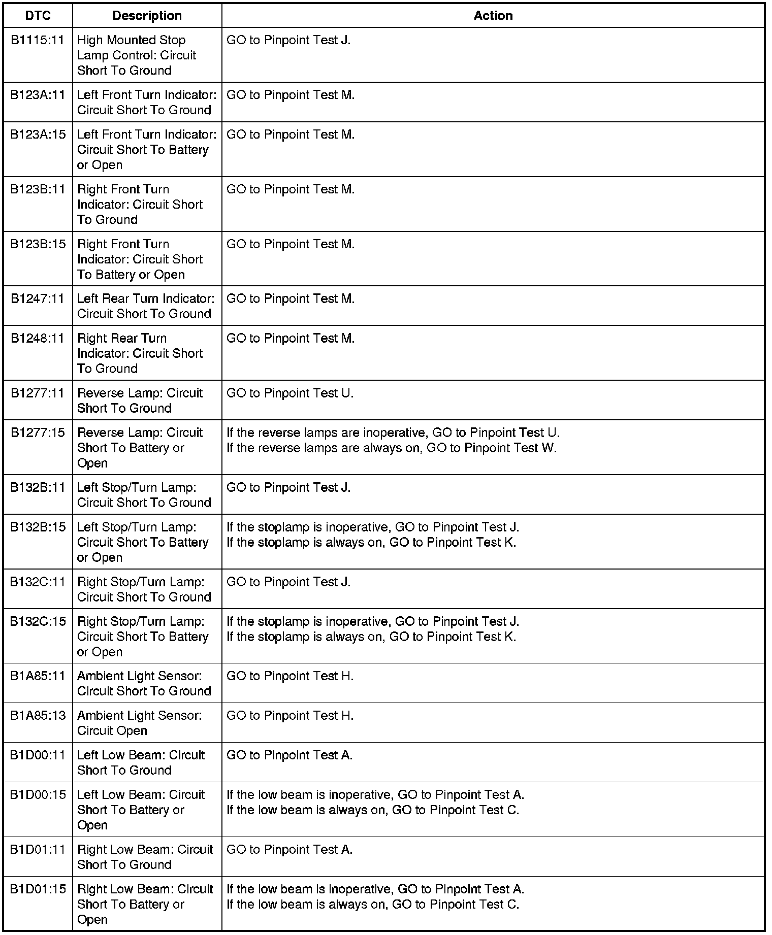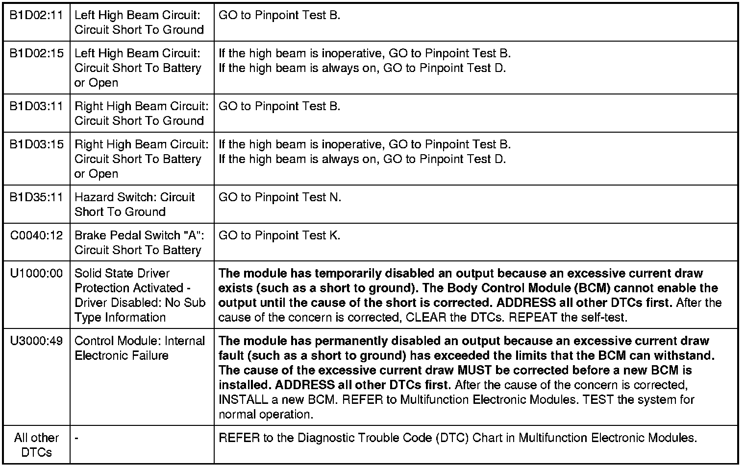 Body Control Module (BCM) DTC Chart