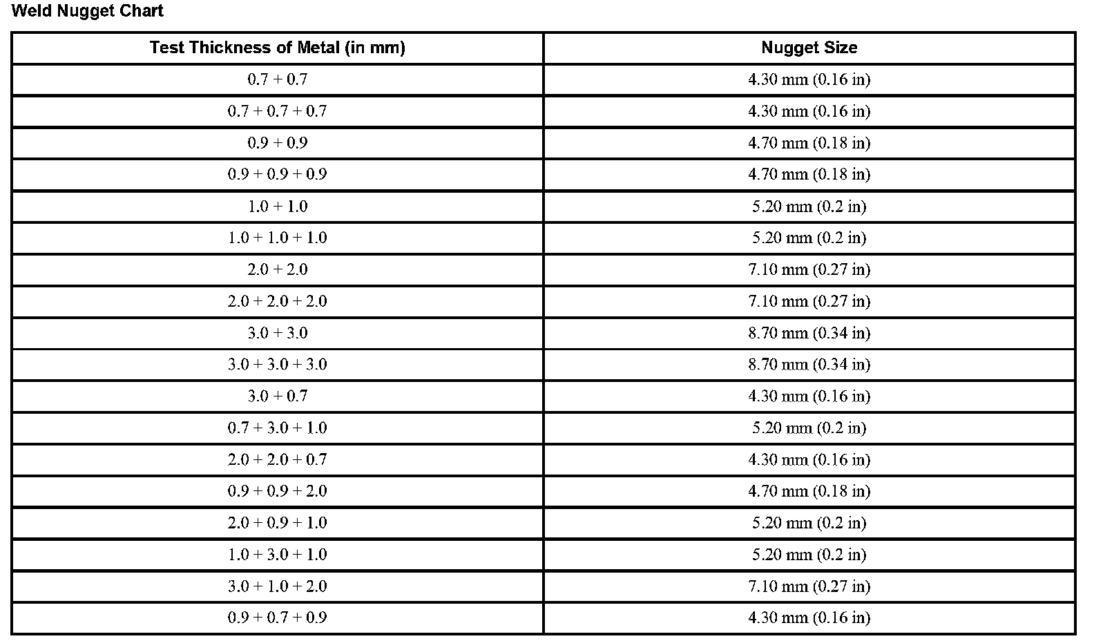 Weld Nugget Chart