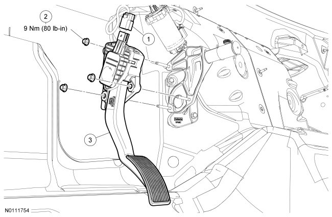 NOTE: The brake pedal and the accelerator pedal must be indexed when installing a new cable or a new adjustable pedal motor and bracket assembly.