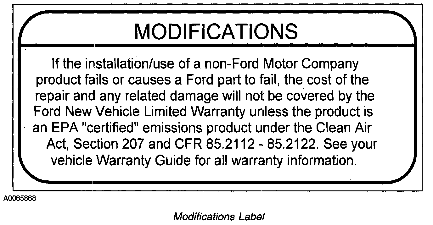 Modifications or additions to the vehicle may cause incorrect operation of the OBD system. Performance modifications that cause a Ford part to fail may not be covered by the Ford New Vehicle Limited Warranty. Carefully install burglar alarms, cellular telephones, and CB radios. Do not install these devices by tapping into or running wires close to the powertrain control system wires or components.