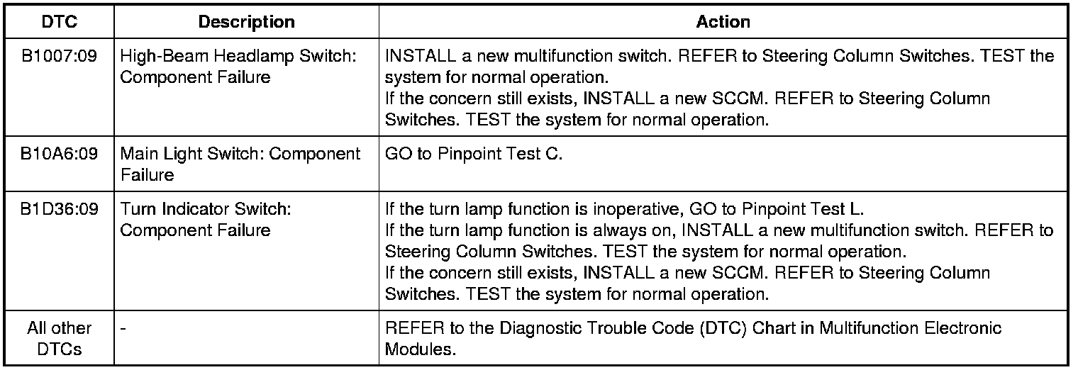 Steering Column Control Module (SCCM) DTC Chart