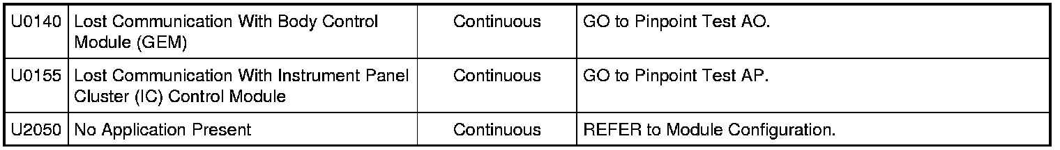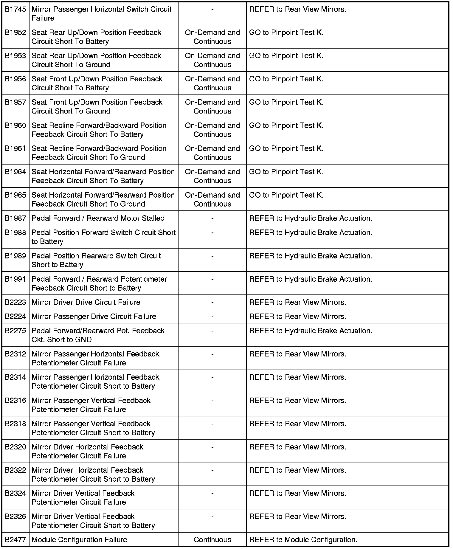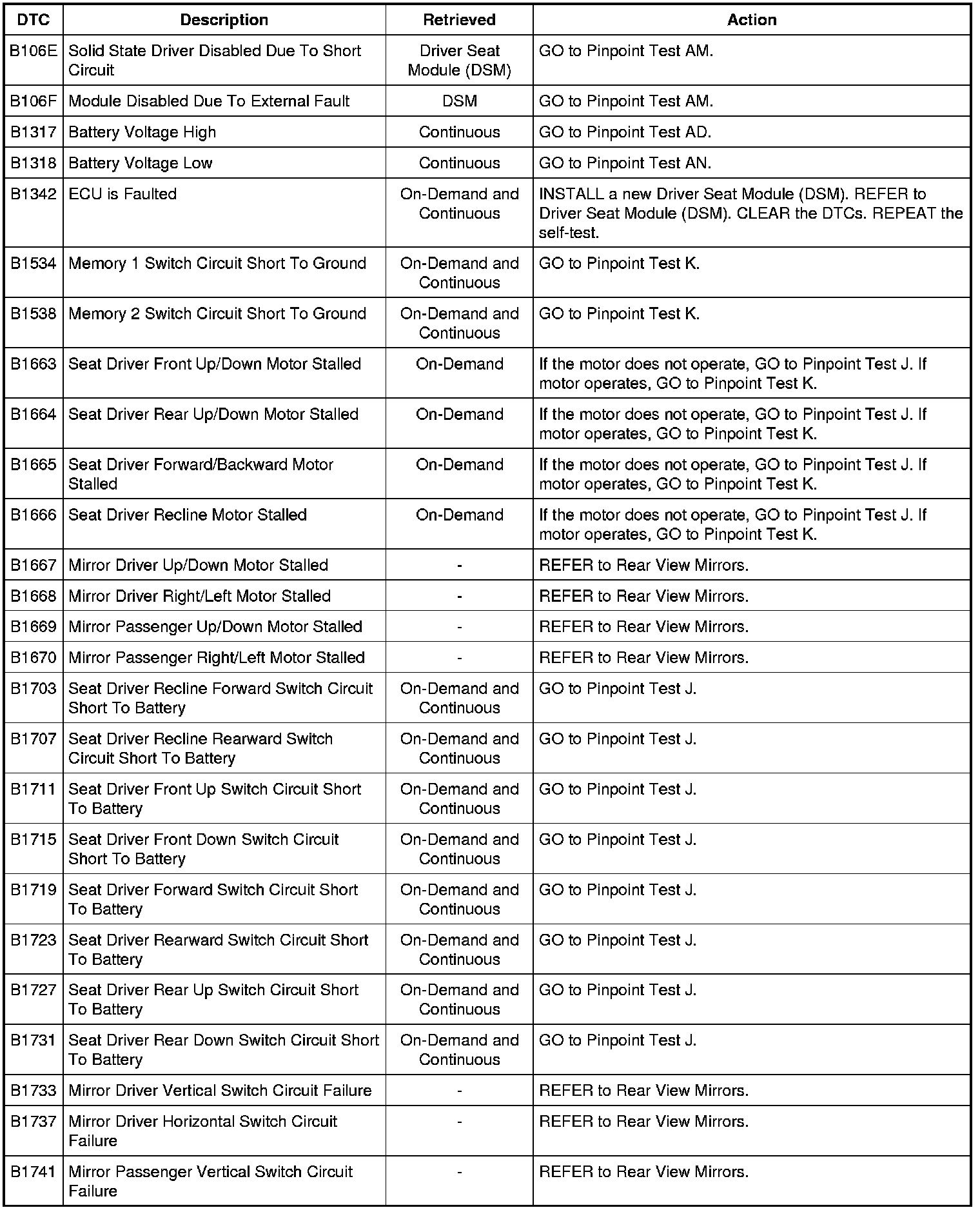 Driver Seat Module (DSM) DTC Chart