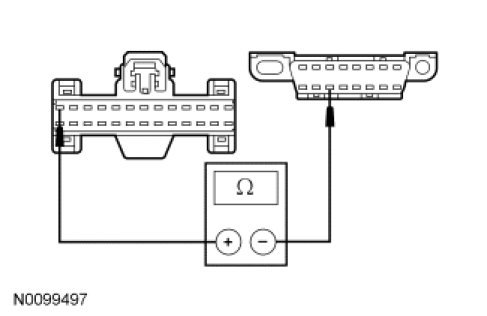 - Measure the resistance between the SJB C2280b-37, circuit VDB06 (GY/OG), harness side and the DLC C251-3, circuit VDB06 (GY/OG), harness side.