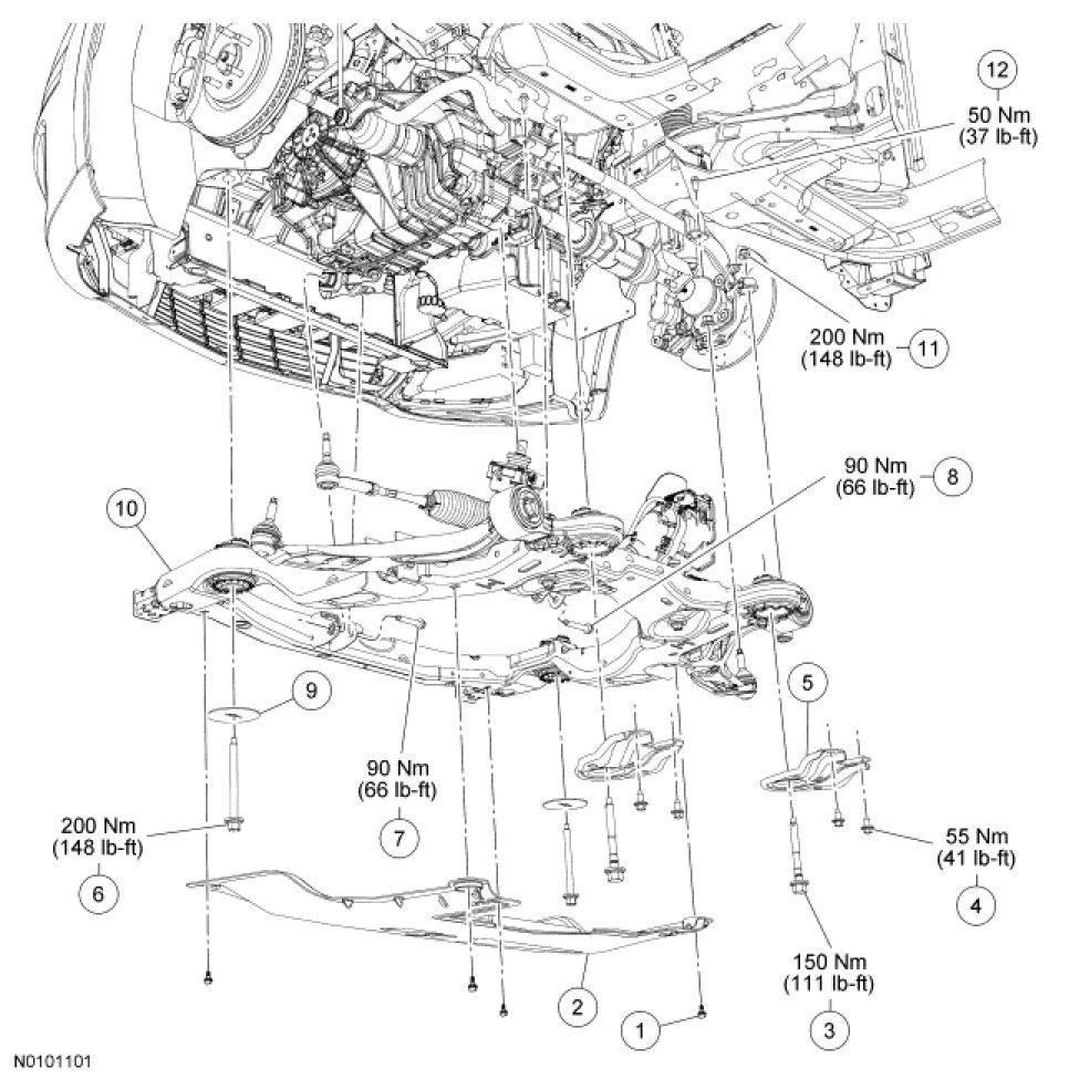 Tighten the 4 new subframe bracket-to-body bolts to 55 Nm (41 lb-ft).