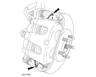 NOTE: If installing new brake pads, make sure to install all new hardware and specified lubricant (8U7Z-19A506-A) supplied with the brake pad kit. Refer to the brake pad instruction sheet when applying lubricant.