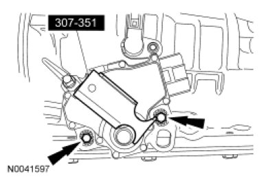 2. NOTICE: Tightening one screw before tightening the other may cause the Transmission Range (TR) sensor to bind or become damaged.
