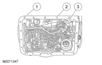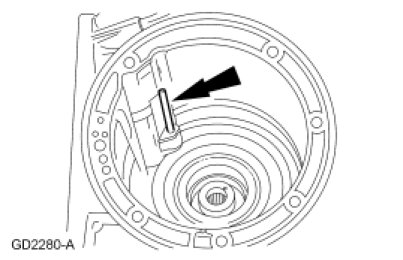 11. NOTICE: Use care not to damage the transmission fluid pan rail surface when installing the retaining pin.