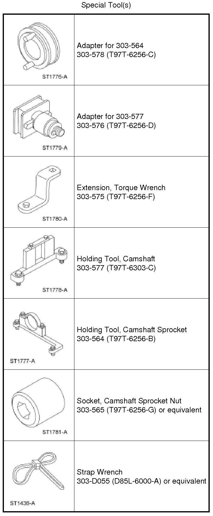 27. Remove the Camshaft Sprocket Holding Tool, the Adapter for 303-564, the Camshaft Holding Tool and the Adapter for 303-577 from the LH cylinder head.
