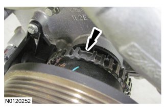 5. NOTICE: While turning the crankshaft pulley, take care to not overturn the crankshaft pulley or damage to the crankshaft pulley timing ring may occur.