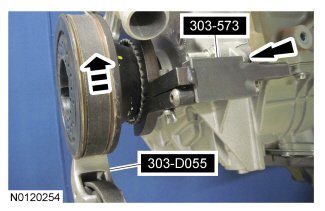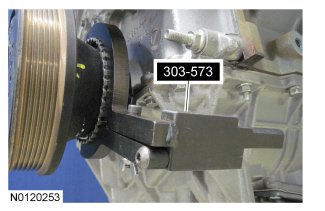 18. Install the Camshaft Sprocket Holding Tool and the Adapter for 303-564 on the front of the LH cylinder head and, if necessary, tighten the top 2 clamp bolts to 10 Nm (89 lb-in).