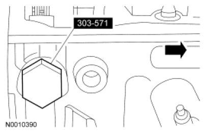 6. Install the Camshaft Sprocket Holding Tool and the Adapter for 303-564 to the RH cylinder head and, if necessary, tighten the 2 top clamp bolts to 10 Nm (89 lb-in).