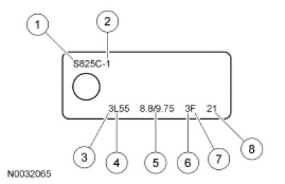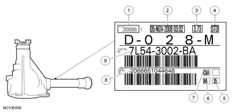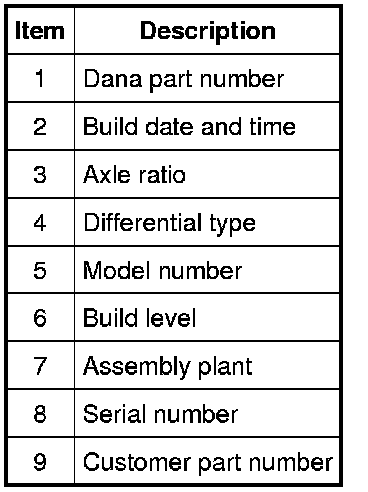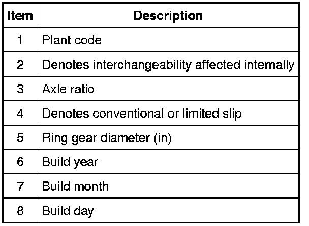 The axle ratio may be verified by checking the printed label on the axle housing. If worn or not visible, the Vehicle Identification Number (VIN) can be typed in the service parts ordering system or the Vehicle Certification (VC) label may be used to correctly identify the axle and ratio. The VC label is located in the driver door jamb. The first 2 digits of the axle code indicate the rear axle and the third digit refers to the front axle, if so equipped. For information on the VC label, refer to Identification Codes Application and ID.