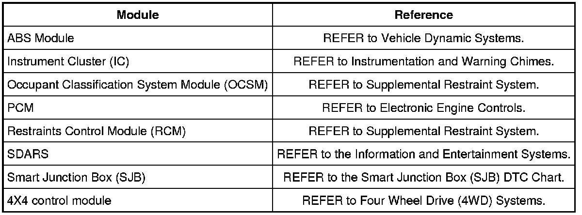 Each module has a comprehensive DTC chart listed in the appropriate information.. Refer to the table below for the appropriate information.