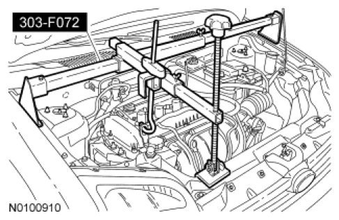 NOTICE: Do not loosen or remove the crankshaft pulley bolt without first installing the special tools as instructed in this procedure. The crankshaft pulley and the crankshaft timing sprocket are not keyed to the crankshaft. The crankshaft, the crankshaft sprocket and the pulley are fitted together by friction, using diamond washers between the flange faces on each part. For that reason, the crankshaft sprocket is also unfastened if the pulley bolt is loosened. Before any repair requiring loosening or removal of the crankshaft pulley bolt, the crankshaft and camshafts must be locked in place by the special service tools, otherwise severe engine damage can occur.