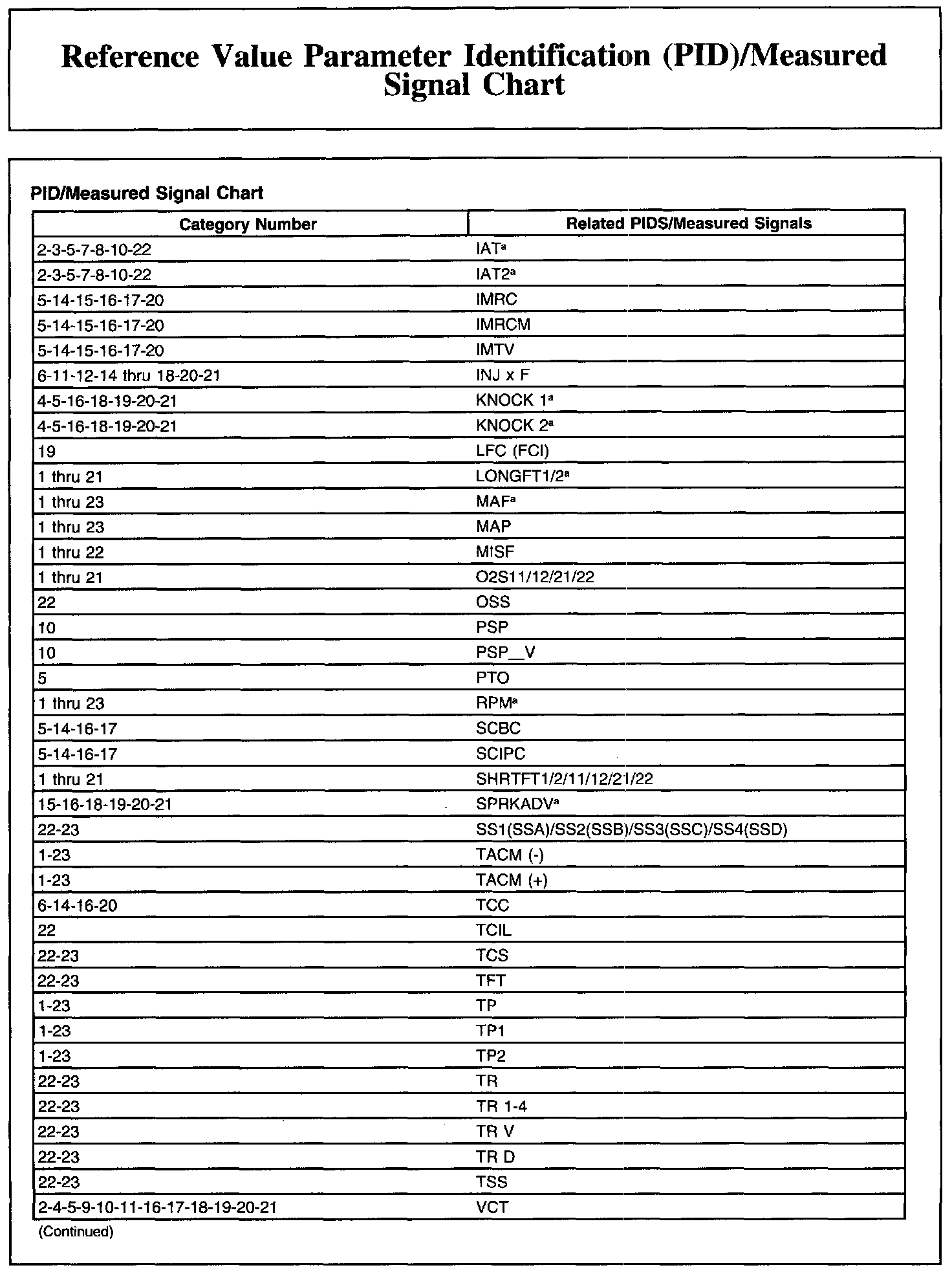 REFERENCE VALUE PARAMETER IDENTIFICATION (PID)/MEASURED SIGNAL CHART