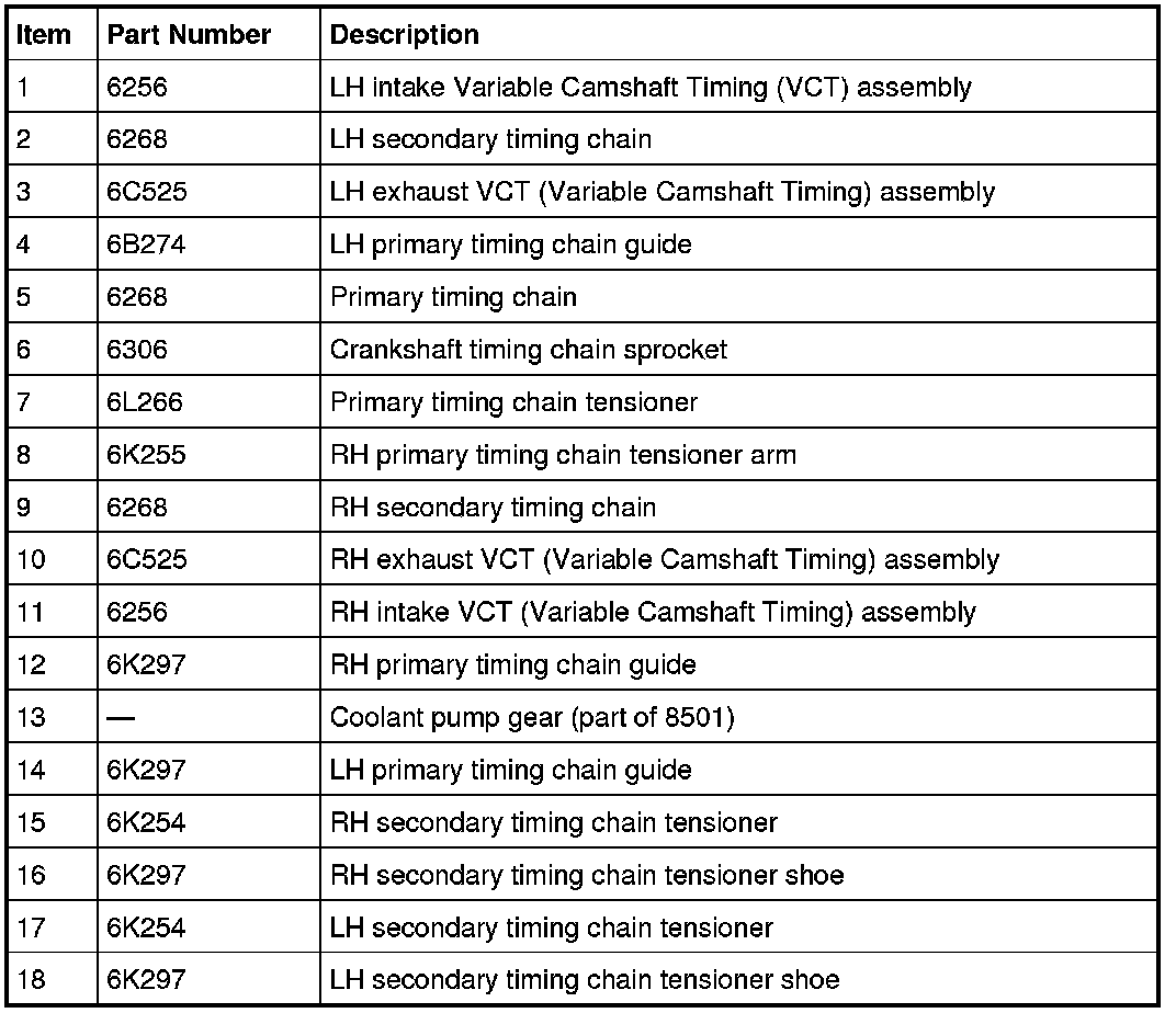 - There is 48 links in between the RH intake VCT (Variable Camshaft Timing) assembly colored link (1) and the LH intake VCT (Variable Camshaft Timing) assembly colored link (2).