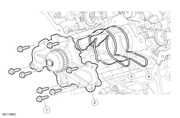 2. Tighten the coolant pump bolts in the sequence shown in 2 stages.