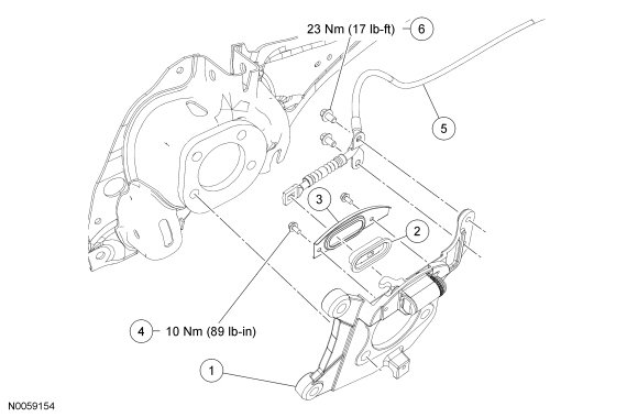2. Remove the 2 parking brake cable-to-support plate bolts, disconnect the parking brake cable from the lever and position the cable aside.