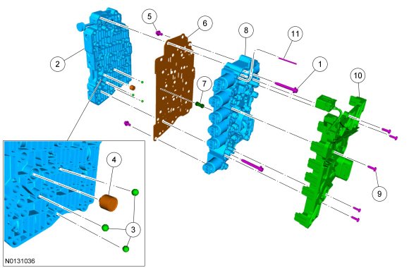 10. Install the new separator plate and the 2 separator plate-to-solenoid body bolts.