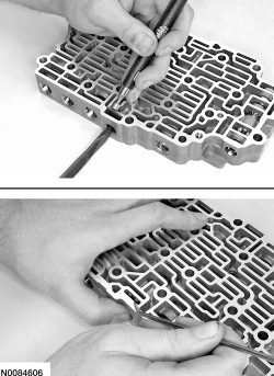 5. NOTICE: Remove the valves by tapping the valve body on the palm of the hand to slide the valves out of the bores or by threading a 4-mm bolt into the valves and pulling them out. It may be necessary to remove the valves and springs using a pick. If it is necessary to use a pick, use extreme caution to prevent damaging the valves or valve bores. If necessary, disassemble parts of the main control valve body in small groups. Take special care when handling the main control components, since they are the most precise and delicate parts of the transmission. Neatly arrange the parts as they are removed to avoid mixing similar pieces.