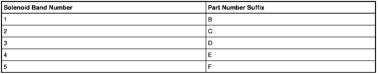 24. Determine the part number suffix by checking the solenoid service band number etched on the side of the solenoid. The band number is the last number in the group on the side of the solenoid and will be a 1, 2, 3, 4 or 5. Use the following table to determine the part number suffix and match the new solenoid base part number and suffix with the old solenoid. Visual check.