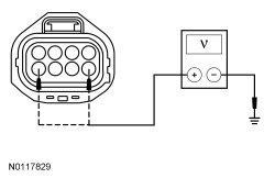 - Measure the voltage between AWD (All-Wheel Drive) relay module C4379-5, circuit CCF21 (VT/WH), harness side and chassis ground; and between AWD (All-Wheel Drive) relay module C4379-8, circuit RCF21 (WH/VT), harness side and chassis ground.