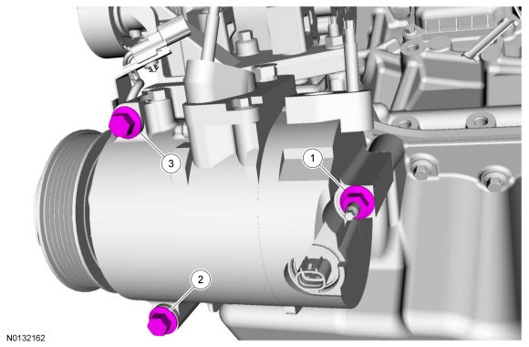 6. Tighten the A/C compressor bolts and nut in the sequence shown.
