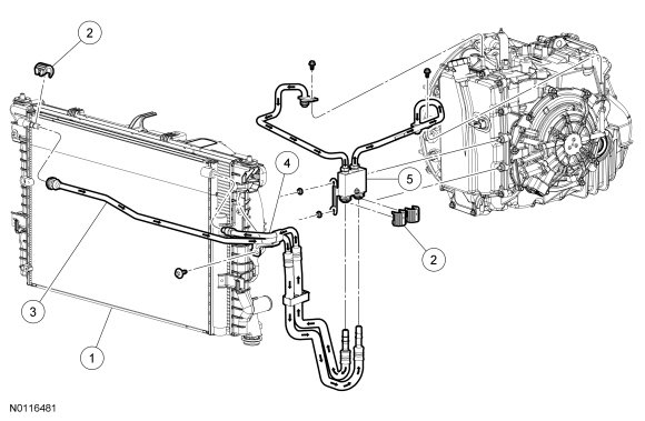 6. Connect one end of a hose to the cooler return tube and route other end of the hose up to a point where it can be inserted into the funnel at the transmission fluid filler tube.