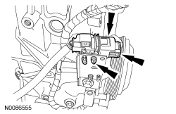 11. Detach the vehicle high-voltage electrical system electrical connector retainer from the accessory drive belt tensioner.