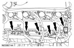 31. Disconnect the 4 fuel injector electrical connectors, radio capacitor electrical connector and the Camshaft Position (CMP) sensor electrical connector.
