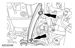 2. While holding the ratchet mechanism in the released position, compress the tensioner by pushing the timing chain arm toward the tensioner.
