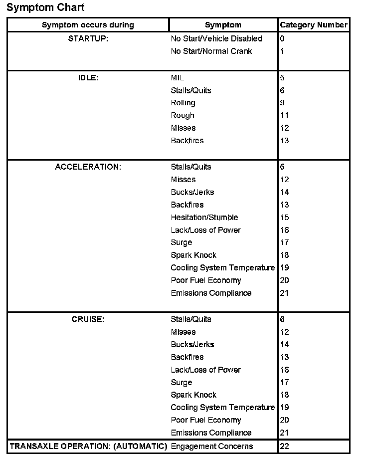 REFERENCE VALUE SYMPTOM CHARTThe Reference Value Symptom Chart provides guidance in selecting the appropriate parameter identification (PID) or measured signal related to the fault area. Select a symptom from the symptom chart along with the category number and go to the PID/Measured Signal Chart. For multiple symptoms, select the symptom that is most evident. Reference Value (PID)/Measured Signal Chart