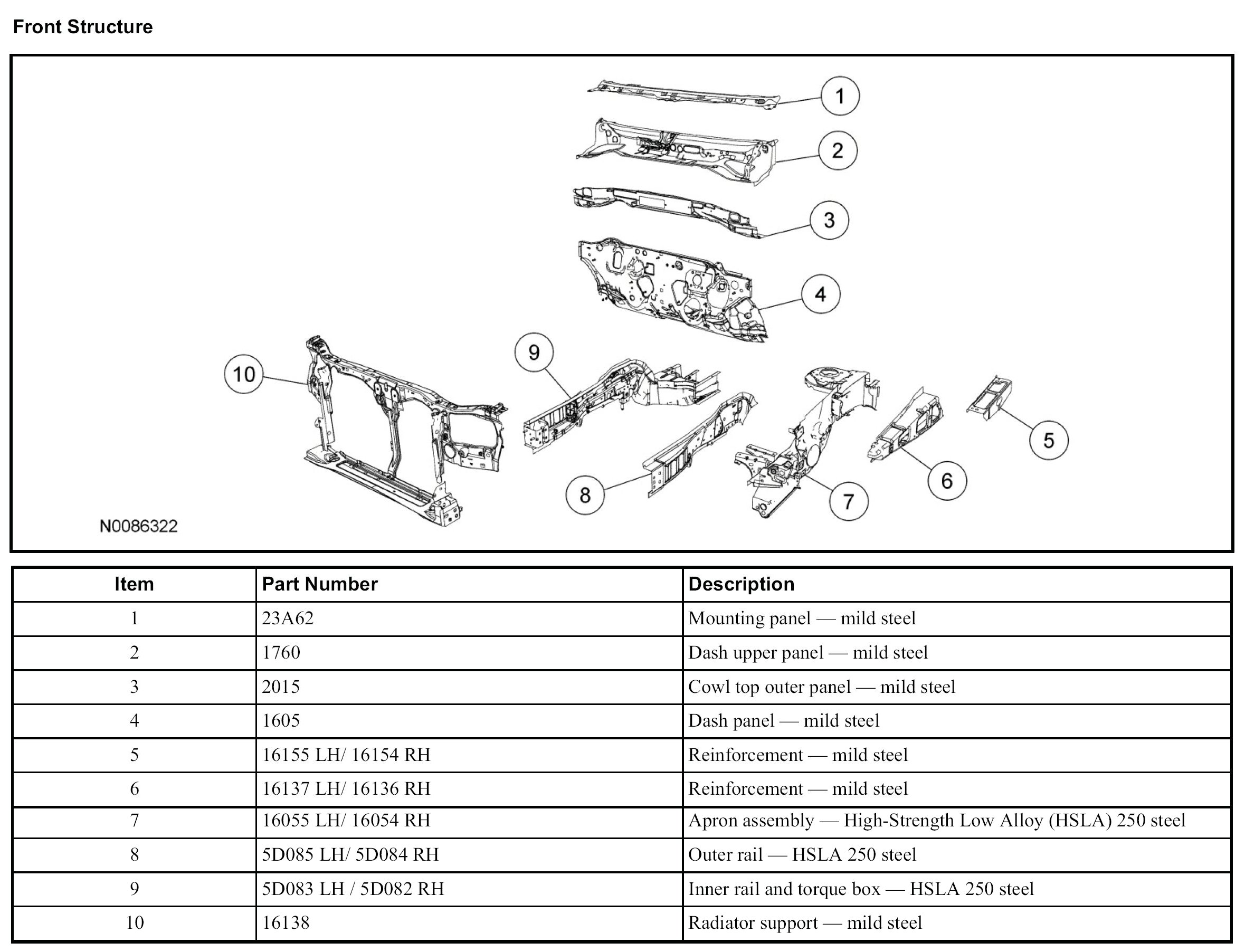- Ford Motor Company does not endorse, cannot attest to, and makes no representations regarding structural repairs (frames, rails, aprons and body panels) carried out using non-genuine Ford Motor Company parts or non-Ford-approved methods. In particular, Ford makes no representations that the vehicle will meet any crash safety or anti-corrosion performance requirement. Such parts and methods have not been tested by Ford, and may not meet Ford's requirements for safety, performance, strength, quality, durability and corrosion protection. Ford Motor Company bears no responsibility or liability of any kind if repairs are performed using alternative structural component repair procedures and/or parts.