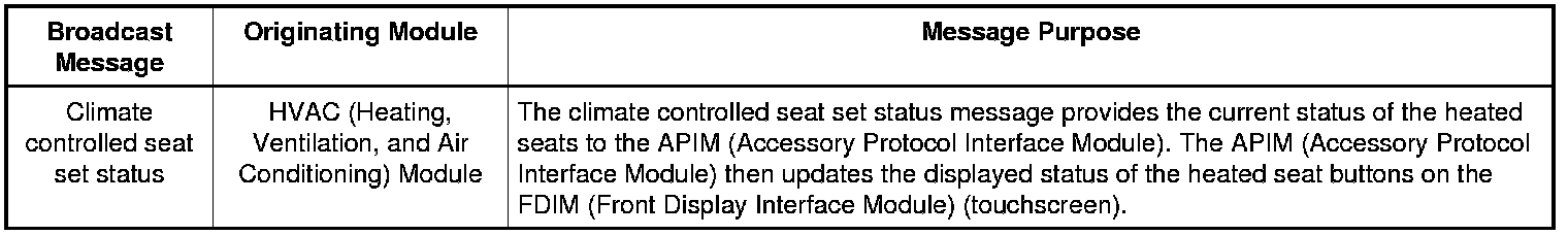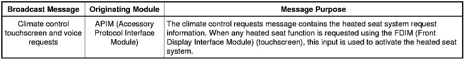 The driver and passenger heated seat buttons are selected from the touchscreen interface. When the heated seat button is pressed on the touchscreen interface, the APIM (Accessory Protocol Interface Module) sends the request message to the FCIM (Front Controls Interface Module) over the I-CAN (Infotainment Controller Area Network). When a heated seat request message has been received from the APIM (Accessory Protocol Interface Module), the FCIM (Front Controls Interface Module) sends the request message to the IPC (Instrument Panel Cluster) over the I-CAN (Infotainment Controller Area Network). The IPC (Instrument Panel Cluster) sends the message to the BCM (Body Control Module) over the HS-CAN (High Speed Controller Area Network). The message is then sent to the HVAC (Heating, Ventilation, and Air Conditioning) module over the MS-CAN (Medium Speed Controller Area Network). Upon receiving the request, the HVAC (Heating, Ventilation, and Air Conditioning) module supplies voltage to the appropriate driver and/or passenger seat cushion and backrest heater mats.