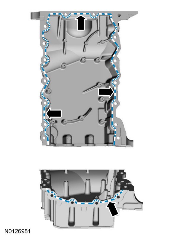 Apply a 3 mm (0.12 in) bead of Motorcraft(R) High Performance Engine RTV Silicone to the sealing surface of the oil pan-to-engine block and to the oil pan-to-engine front cover mating surface.
