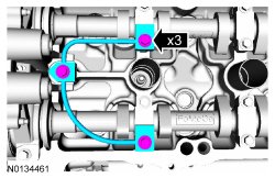 40. Install the RH (Right Hand) valve train oil tube and the 3 bolts and tighten in 2 stages: