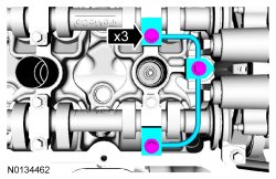 42. Install the LH (Left Hand) valve train oil tube and the 3 bolts and tighten in 2 stages: