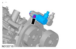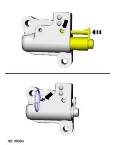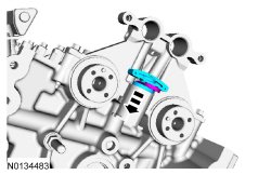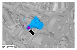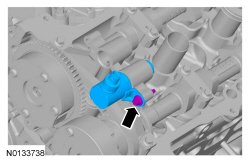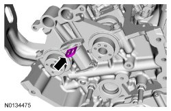 38. NOTICE: Do not use excessive force when installing the VCT (Variable Camshaft Timing)) oil control solenoid. Damage to the mega cap could cause the cylinder head to be inoperable. If difficult to install the VCT (Variable Camshaft Timing) oil control solenoid, inspect the bore and VCT (Variable Camshaft Timing) oil control solenoid to ensure there are no burrs, sharp edges or contaminants present on the mating surface. Only clean the external surfaces as necessary.