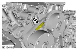 15. NOTE: It may be necessary to rotate the camshafts slightly, to install the LH (Left Hand) secondary timing assembly.