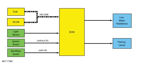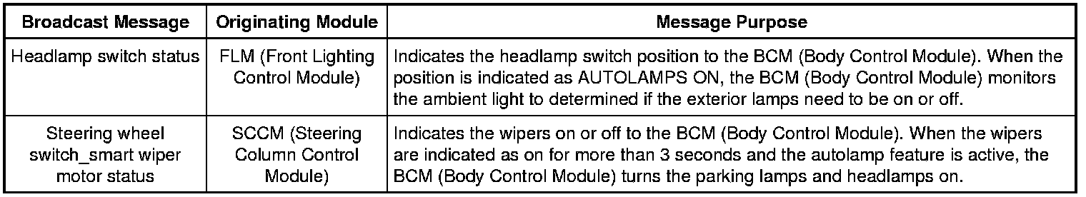 When the BCM (Body Control Module) receives a headlamp switch status message from the FLM (Front Lighting Control Module) indicating a request for the autolamps, the BCM (Body Control Module) monitors the light sensor for the ambient light condition. If the BCM (Body Control Module) determines the ambient light level is dark, the BCM (Body Control Module) supplies voltage to the exterior lamps.