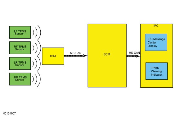 The TPMS (Tire Pressure Monitoring System) system monitors the tire pressure using 4 valve stem mounted TPMS (Tire Pressure Monitoring System) sensors to provide accurate tire pressures. Each individual sensor contains its own battery and transmits tire pressure data to the TPM (Tire Pressure Monitor) module. The TPM (Tire Pressure Monitor) module is a radio receiver that collects the tire pressure data and relays the information via the MS-CAN (Medium Speed Controller Area Network) to the BCM (Body Control Module). All of the TPMS (Tire Pressure Monitoring System) functions are controlled by the BCM (Body Control Module). The TPMS (Tire Pressure Monitoring System) sensors are trained to the BCM (Body Control Module), which records the unique identifier for each TPMS (Tire Pressure Monitoring System) sensor. The BCM (Body Control Module) records where each TPMS (Tire Pressure Monitoring System) sensor is located based on the training order and compares the actual tire pressure with the desired tire pressure as indicated on the VC (Vehicle Certification) label. If the tire pressure deviates from the desired tire pressure the BCM (Body Control Module), using the HS-CAN (High Speed Controller Area Network), signals the IPC (Instrument Panel Cluster) to illuminate the TPMS (Tire Pressure Monitoring System) warning indicator and also displays a message on the message center. The programmed tire pressure cannot be changed.