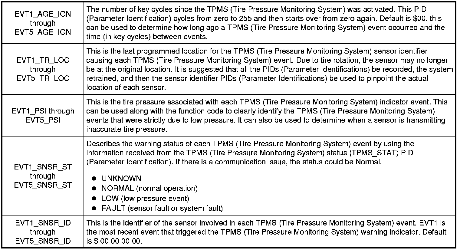 The TPMS (Tire Pressure Monitoring System) uses the TPMS (Tire Pressure Monitoring System) last warning event PIDs (Parameter Identifications) to store detailed information about the last 5 times the TPMS (Tire Pressure Monitoring System) warning indicator was activated. These PIDs (Parameter Identifications) can be used to acquire more information about a particular TPMS (Tire Pressure Monitoring System) event, but must be used carefully.