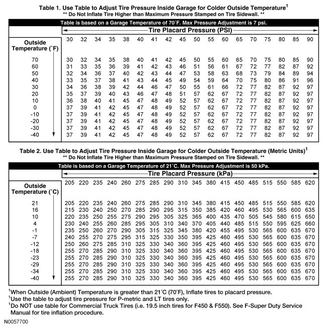 As the ambient temperature decreases by -12.2 C (10 F) tire pressure decreases 6.9 kPa (1 psi). Adjust the tire pressure by 6.9 kPa (1 psi) for each-12.2 C (10 F) ambient temperature drop as necessary to keep the tire at the specified VC (Vehicle Certification) label pressure. To adjust the tire pressure indoors for colder outside temperatures: