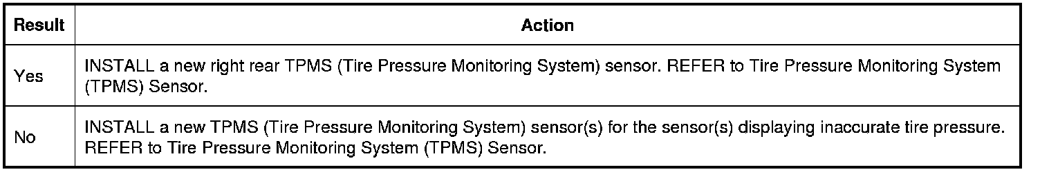 1. Train all 4 TPMS (Tire Pressure Monitoring System) sensors. REFER to Tire Pressure Monitoring System (TPMS) Sensor Training - Intelligent Access (IA) Tire Pressure Monitoring System (TPMS) Sensor Training - Intelligent Access (IA) or REFER to Tire Pressure Monitoring System (TPMS) Sensor Training - Integrated Keyhead Transmitter (IKT) Tire Pressure Monitoring System (TPMS) Sensor Training - Integrated Keyhead Transmitter (IKT).