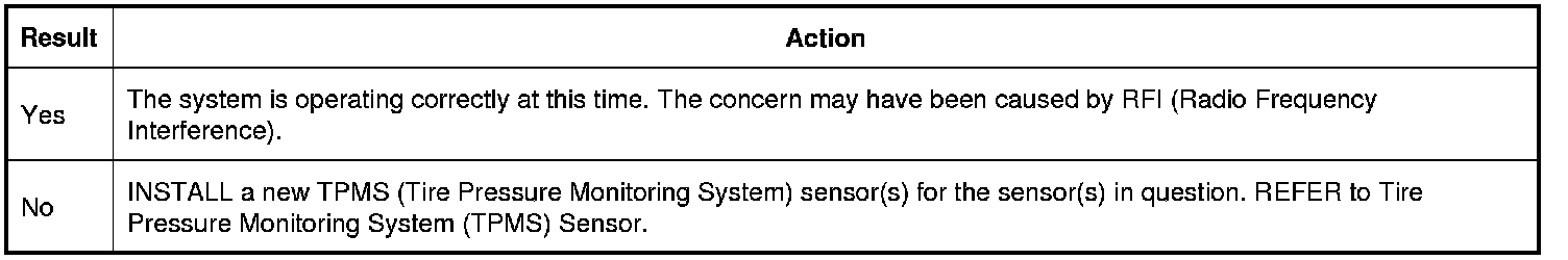 1. TRAIN all 4 TPMS (Tire Pressure Monitoring System) sensors. REFER to Tire Pressure Monitoring System (TPMS) Sensor Training - Intelligent Access (IA) Tire Pressure Monitoring System (TPMS) Sensor Training - Intelligent Access (IA) or REFER to Tire Pressure Monitoring System (TPMS) Sensor Training - Integrated Keyhead Transmitter (IKT) Tire Pressure Monitoring System (TPMS) Sensor Training - Integrated Keyhead Transmitter (IKT).