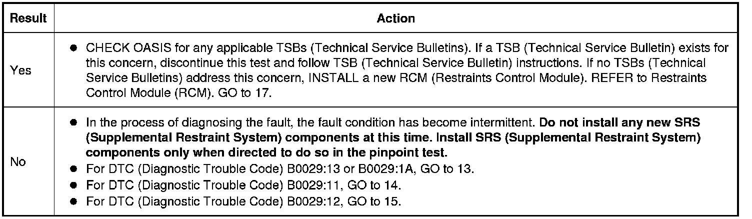 NOTE: This pinpoint test step attempts to change the fault reported by the RCM (Restraints Control Module) by inducing a different fault condition. If the reported fault changes, this indicates the RCM (Restraints Control Module) is functioning correctly and is not the source of the fault.