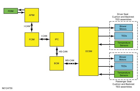 The seat cushion is equipped with a TED (Thermo-Electric Device) assembly that includes a seat blower (fan motor, serviced as an assembly with the TED (Thermo-Electric Device)). Similarly, the seat backrest is also equipped with its own TED (Thermo-Electric Device) assembly with blower. Cabin air is drawn through the blower and distributed to each TED (Thermo-Electric Device) located in the seat cushion and backrest. The TEDs (Thermo-Electric Devices) heat or cool the air, which is then directed into the foam pad and manifold where it is distributed along the surface of the cushion and backrest of the seat. Once the system is activated, the DCSM (Dual Climate Controlled Seat Module) uses a set of flexible algorithms to control the heating/cooling modes and the blower speed dependant on the commanded climate controlled seat settings.