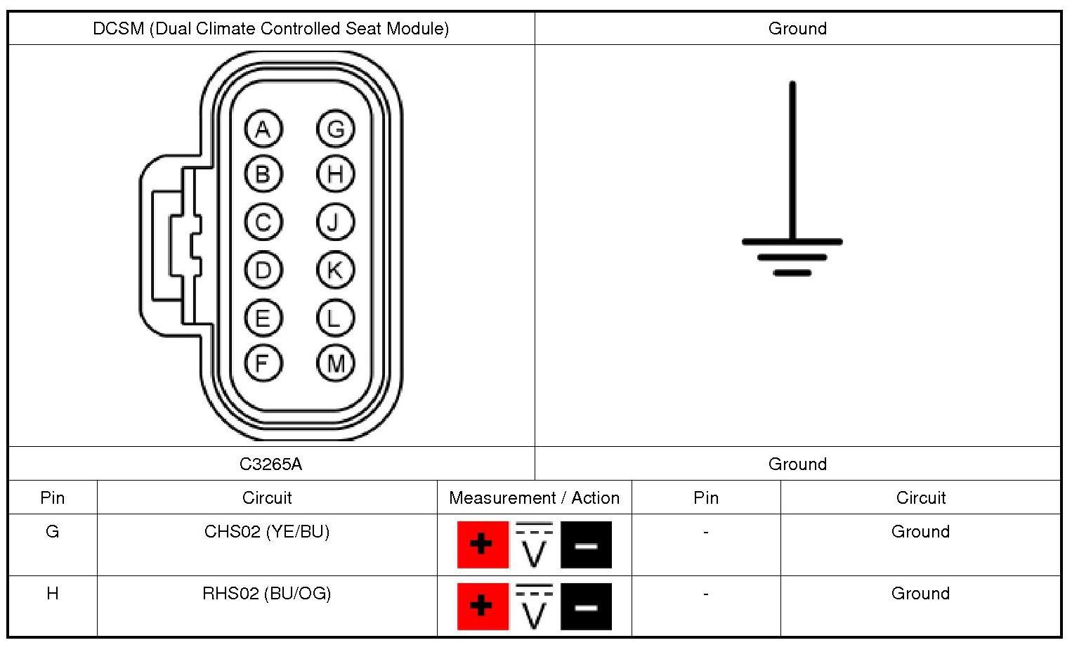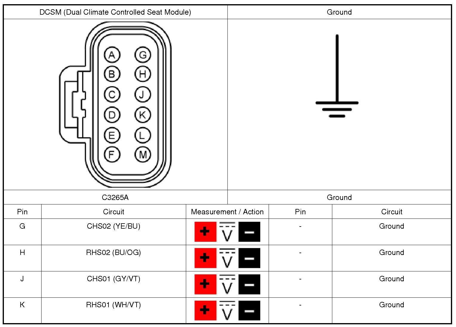 NOTICE: When taking measurements at DCSM (Dual Climate Controlled Seat Module) harness connectors, do not insert the electrical probes into the female connector pins. Inserting the probes into connector pins can cause intermittent or open electrical connections after reassembly resulting in DTCs (Diagnostic Trouble Codes) and system failure. Touching the tip of these connector pins is recommended instead.
